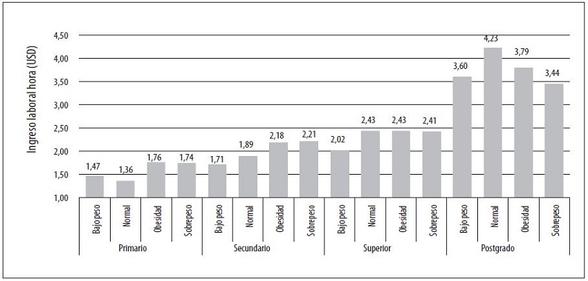 La discriminación por nivel educativo (gráfica 3) evidencia que mayor capital humano trae mejores rendimientos en el mercado laboral. Cuando se interactúan los rangos el IMC con cada nivel educativo, no existen pérdidas o ganancias dentro de cada nivel, pero se mantienen las encontradas en forma agregada entre grado educativo. Sin embargo, en los niveles de posgrado, la presencia de sobrepeso en los trabajadores sí se castiga con una penalidad salarial del 4.5 % frente a los de bajo peso.