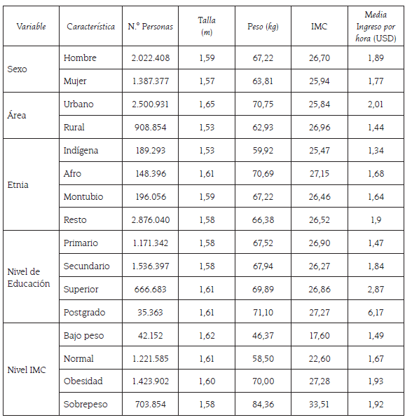 La tabla 1 muestra algunas estadísticas por grupos de interés dentro de la encuesta, tales como la media del ingreso laboral por hora en dólares corrientes, el peso, la talla y el IMC, promedio. En esta población, los hombres constituyen el 59 % de los ocupados con un salario medio por hora de USD 1,89 mientras que para las mujeres es de USD 1,77; igualmente, los hombres son levemente más altos que las mujeres y, en consecuencia, más pesados.