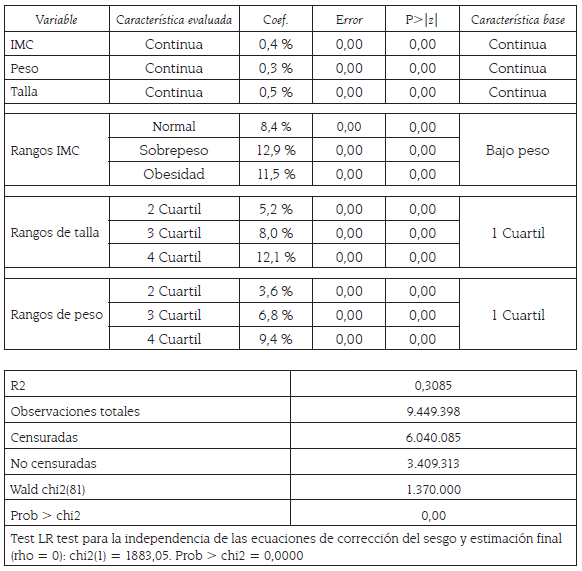 Por cuartiles de rango y peso, estas relaciones mono-tónicamente crecientes se mantienen, a excepción de los coeficientes por rangos de IMC, que muestran que las ganancias en salarios no son uniformes, ya que los salarios de las personas con peso normal, según IMC, son un 8,4 % más altos que las personas con bajo peso, un 12,4 % para las personas con sobrepeso y 11,5 % adicional para personas con obesidad. Es decir, que hasta cierto punto los empleadores premian las condiciones de salud de sus trabajadores al observar mejores grados de peso proporcionalmente a la estatura.