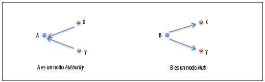 En ci definimos la medida de autoridad del nodo i, como la sumatoria ponderada de las medidas hubs, hk , de los k nodos que están conectados a i, siendo los nodos hubs los que cuentan con el mayor número de conexiones directas con otros nodos dentro de toda la estructura de red.
