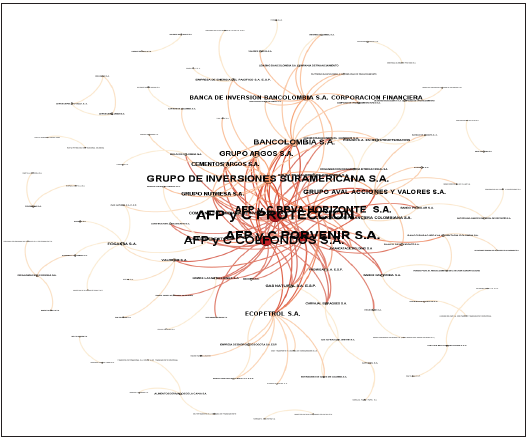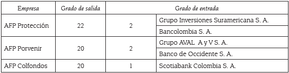 Para la Administradora de Fondos de Pensiones y Cesantías Protección el grado de salida es de 22, lo que significa que esta entidad posee control accionario último en otras 22 empresas mientras que la Sociedad Administradora de Fondos de Pensiones y Cesantías Porvenir presenta propiedad integrada en 20. Otro caso, también de un inversionista institucional, es el de Colfondos S. A. Pensiones y Cesantías que cuenta con control accionario último en 20 firmas.