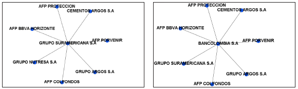El ordenamiento ascendente de los grados de entrada para las 108 firmas muestra que las que tienen máximo valor en este indicador también son inversionistas institucionales, a saber, son el Grupo de Inversiones Suramericana S. A. y Bancolombia S. A, cada una con grado de entrada igual a 7. Como se puede observar en la red de ego del Grupo I Suramericana S. A., es la empresa en la que recae el control accionario último de cuatro fondos de pensiones, del Grupo Argos, de Cementos Argos y del Grupo Nutresa. Por su parte, en Bancolombia tienen propiedad integrada los mismos fondos de pensiones y las filiales de Argos que aparecen en el caso anterior, con la particularidad de que el Grupo I Suramericana también tiene control accionario último en Bancolombia S. A. (ver gráfico 4). Este resultado muestra que existe una fuerte relación entre inversionistas institucionales, por lo que el fallo en la actividad de alguno de ellos supone un grave riesgo para el mercado accionario colombiano, como un todo.