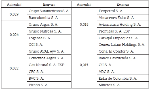 Para este análisis, las empresas que son autoridad son aquellas que presentan los grados más altos de entrada; por lo tanto, son las firmas cuyo control accionario último está concentrado en las empresas que tienen conexión hacia ella. Adicionalmente, la medida de autoridad en el contexto del papel que juegan los inversionistas institucionales en el mercado accionario colombiano se toma como un mecanismo para medir la importancia sistémica de cada uno de ellos, esto es, una falla en su operar significaría una disminución en la solvencia y en el capital del resto de empresas de la red, en especial, en aquellas que tienen control accionario último sobre ellos, lo que significaría mayor riesgo de insolvencia en las empresas con las que se conectan y, además, pasan a ser instituciones de un importante impacto sistémico durante períodos de estrés financiero.
