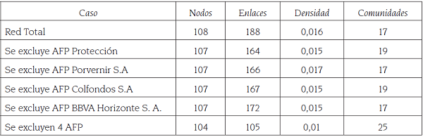 ¿Qué pasaría si por choques exógenos a la estructura de red aquí analizada, los fondos de pensiones, en su papel de inversionistas institucionales, desaparecieran del mercado accionario colombiano? Los ejercicios de simular la salida de los fondos de pensiones muestran que ante la ausencia de AFP Protección, en la red total se perderían 24 enlaces, es decir, se pierde la participación integrada de 24 empresas, la red pierde densidad (menos conexiones) y se fracciona en más comunidades; algo similar sucede cuando se deja por fuera a AFP Colfondos. En el caso extremo, en el que faltaran los 4 AFP analizados, la red total perdería el control accionario último de 83 empresas y se fraccionaría en 25 comunidades (ver tabla 5).