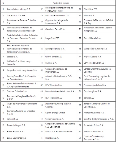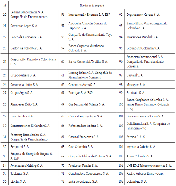 (11)Los datos sobre participaciones directas de las empresas colombianas en las demás empresas de la muestra fueron tomados de la base de datos Benchmark para el año 20122. Se cuenta con la información para 108 organizaciones3 que incluyen empresas, bancos comerciales, fondos de pensiones, corporaciones financieras y sociedades administradoras de valores; también se incluyen firmas pertenecientes a los sectores industrial, minero, de construcciones, alimentos, de servicios no financieros (donde registran compañías de televisión, telefonía, servicios domiciliarios, comercio, entre otros). Una lista detallada de las empresas analizadas está en los anexos. Se buscó incluir las trescientas empresas más grandes según el tamaño de sus activos, las cuales equivalen al 62% de los activos de todas las empresas del sector real y, además, se consideraron 100 empresas del sector financiero que tienen un peso del 95% en el total de activos de ese sector. Luego de filtrar la base, de acuerdo con las empresas que tuvieran la información requerida sobre participaciones accionaras cruzadas, la muestra final quedó reducida a 108 empresas.