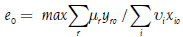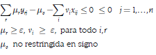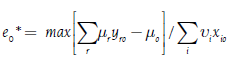 Considere un conjunto compuesto por n DMU denotadas como DMUj (j=1,…, n) las cuales utilizan recursos xij (i=1,…, m) y generan s salidas yrj (r=1,…, s) , y parta del hecho de que los multiplicadores vi, ur asociados con i entradas y r salidas, respectivamente, son conocidos. Entonces, en específico, si la DMU0 está bajo estudio, según Rodríguez (2011, p. 74) este modelo está dando la solución del problema de programación fraccional para la medida de eficiencia de esa DMU0 así: