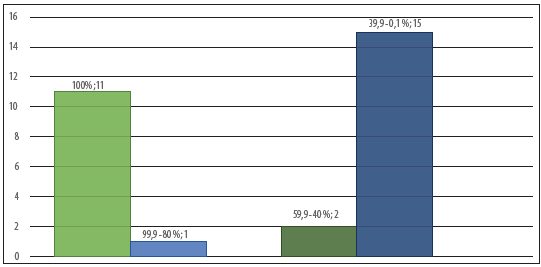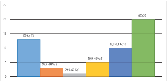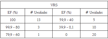 Cuando se analiza el número de unidades por rango de eficiencia, se establece que el rango donde hay mayor cantidad de unidades es el rango del 0% y el segundo rango es el de 100%, como se muestra en la tabla 1 y en la figura 3.