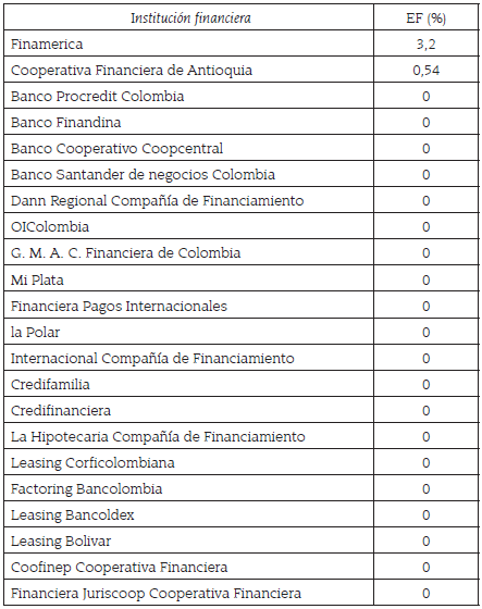 RESUMO: Existe uma correlação muito alta entre a exclusão dos serviços oferecidos pelo setor financeiro formal e a pobreza. Por isso, neste trabalho, mede-se, para o ano 2014, a eficiência da inclusão financeira na Colômbia. Na análise, incluem-se os bancos, as companhias de financiamento e as cooperativas financeiras, que são estudados de maneira não global, mediante a aplicação da análise envolvente de dados e pela metodologia não paramétrica de programação linear que, por meio de um duplo processo de otimização, gera indicadores de eficiência. Neste trabalho, dá-se res posta às seguintes questões: que tipo de entidades são eficientes e em que número? Como é a distribuição das entidades segundo o intervalo de índice de eficiência? Há algum grupo que se diferencie? Os resultados demonstram que somente 25% das instituições analisadas são eficientes.