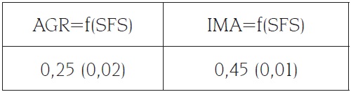 Se aplicó el test de Johansen para descartar una eventual relación espuria. Los resultados muestran que para la relación (AGR)=f(SFS), se rechaza la hipótesis nula de no cointegración I(2) con una probabilidad de 99% (Trace statistic 10,94; critical value 3,84 y Prob. 0,0009). Para la relación (IMA)=f(SFS), tambien se rechaza la hipótesis nula de no cointegración I(2) con una probabilidad de 99% (trace statistic 12,64; critical value 3,84 y Prob. 0,0004). Estos resultados sugieren que en la economía colombiana existe una relación positiva entre las variables señaladas.