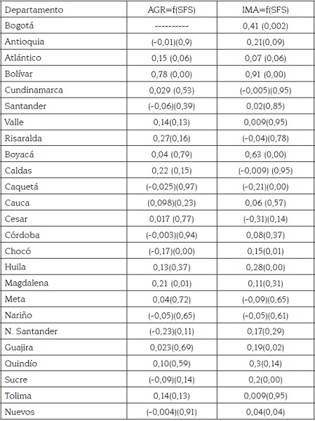 Al estimar los anteriores parámetros para hallar la relación entre actividad agropecuaria (AGR) y los servicios financieros (SFS), así como entre la industria (IMA) y los servicios financieros (SFS) por cada departamento, los resultados son completamente dispersos, y muy pocos de ellos son estadísticamente significativos, tal como se presenta en la tabla 2. Esto sugiere que las condiciones de desarrollo del país presentan altos grados de heterogeneidad, lo cual constituye una prueba de que las condiciones de subdesarrollo persisten y se extienden geográficamente a las diferentes regiones de Colombia.