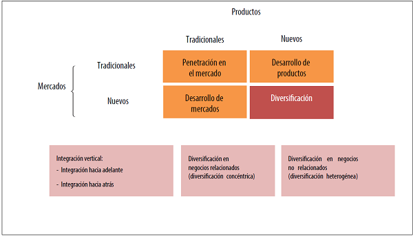 En el gráfico 1 se observa el alcance de la estrategia, que ocurre cuando se decide crecer con nuevas actividades. La estrategia tiene tres variaciones: integración vertical, diversificación en negocios relacionados y diversificación en negocios no relacionados. Chiavenato y Sapiro (2011) exponen que este es uno de los modelos estratégicos que actúan como herramienta para la toma de decisiones, y coinciden con Walker et al. (2005) respecto a que la estrategia es arriesgada porque no depende de los productos de la organización que han logrado éxito ni de su posición en mercados establecidos; en ocasiones funciona, y en otras, no. La estrategia debe considerar producir lo que los compradores necesitan y no lo que el país está en capacidad de hacer.