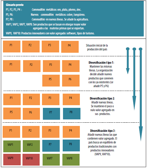 Hay hasta tres diferentes tipos de diversificación por los cuales puede optar el productor, desde aquellos en que mantienen su estado natural hasta llegar a un estadio superior en el cual se le agrega valor o se transforma el producto natural, como es el caso de los insumos agrícolas. Cualquiera de los tres modelos que se fomente en cuanto a productos no tradicionales es favorable a la disminución del riesgo de los precios internacionales de los commodities mineros. Perú está en el proceso inicial de pasar del segundo al tercer tipo, lo que toma tiempo para su consolidación.