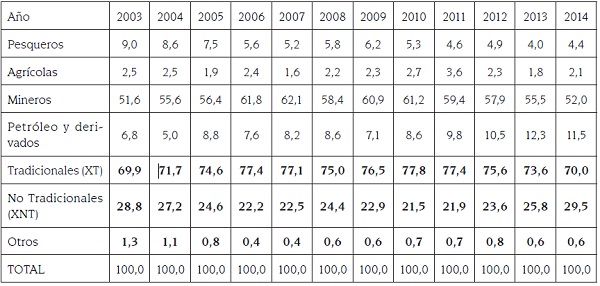 El valor relativo de las exportaciones no tradicionales (XNT) llega a ser el 25,0% del total exportado, en promedio, para el período 2001-2014. En el año 2014 representan el 29,5% del total exportado, la mejor tasa porcentual del período en evaluación, lo que se debe a un menor monto de exportaciones tradicionales (XT) y un pequeño incremento en las XNT (tabla 1). Se menciona el leve crecimiento en las XNT porque estas se mantienen en un nivel similar desde 2012. La principal razón del crecimiento relativo de las XNT es la disminución de las exportaciones de commodities: en 2012 se llega a la cifra de 35.869 millones de US$, y en 2014 a 27.686 millones de US$ (tabla 3). Es el riesgo que el país asume cuando su producción y exportaciones se canalizan a los commodities. Decidir por la diversificación productiva optando por nuevos productos, nuevas industrias, es oportuno para disminuir el riesgo de los commodities, aunque no lo evita, porque hay otros factores del entorno que afectan todo proceso económico.