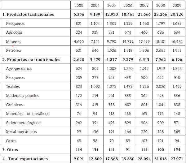 Los esfuerzos por diferenciar las exportaciones como país se observan en las tablas 2 y 3, que presentan los resultados de las ventas internacionales (exportaciones) de Perú. Los resultados muestran que se sigue exportando con mayor énfasis commodities, pero también evidencia que la agricultura no tradicional está, en el período analizado, aumentando su participación en las exportaciones. En el período 2003-2009 las exportaciones de productos tradicionales se multiplicaron 3,3 veces, llegando a US$ 20.720 millones. Los productos no tradicionales se multiplicaron 2,4 veces, llegando a la cifra de US$ 6.196 millones.