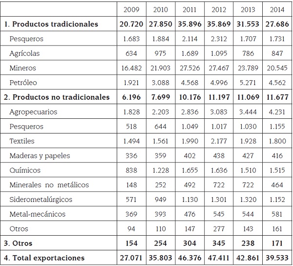 La economía peruana, como la mayoría de las economías latinoamericanas, tiene como característica ser proveedora de materias primas para el mercado internacional, lo que se conoce como país primario exportador. Un país exportador de commodities o productos tradicionales se convierte en una economía frágil a los cambios imprevistos de los precios internacionales de estos. En la tabla 1 se observa que del total de exportaciones que realiza Perú, en promedio, el 75% corresponde a commodities teniendo una participación importante los productos mineros, que en los últimos años han visto caer sus precios en el mercado internacional. Luego, siguen los productos pesqueros y agrícolas, estos últimos con una cada vez menor significancia estadística en las exportaciones.