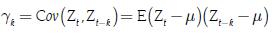 Sea {Zt } un proceso estacionario con E(Zt) = μ y Var(Zt ) = σ2 constantes, se define la función de autocovarianza (FACV) como: