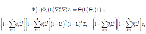 (10)Donde Φ(L) es el polinomio de coeficientes, con operador de rezagos L del componente autorregresivoAR; y Φs(L) el símil al caso anterior, pero aplicado al proceso autorregresivo de la parte estacional SAR. Además, Φ(L) y Φs(L) son los polinomios de coeficientes del componente de media móvil MA y su análogo estacional SMA, respectivamente.