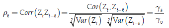 (1)La autocorrelación (ρk ) mide la relación (o dependencia, más no causalidad) entre dos variables separadas por k períodos. De esta manera, la función de autocorrelación simple (FAC) se expresa mediante la ecuación [2].