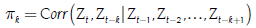 Por otra parte, la autocorrelación parcial mide la dependencia entre Zt y Z t−k cuando se elimina el efecto de Z t-1, Z t-2,…,Z t-k+1.Se expresa mediante: