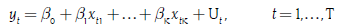 (6)Al contemplar una muestra de T datos en los que se observa las variables Y y X = (X1,.…, XK)' se tiene (xt,yt), i = 1,…,t, donde xt = (xt1, xt2, …, xtK). Luego, el modelo de regresión lineal múltiple asume que: