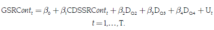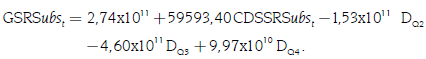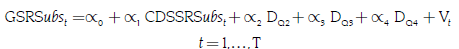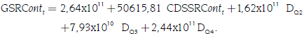 (9)Donde GSRcontt es el gasto en salud en el régimen contributivo en el período t; GSRSubst es el gasto en salud en el régimen subsidiado en el período t; CDSSRContt es la cantidad demandada de servicios de salud en el régimen contributivo en el período t; CDSSRSubst es la cantidad demandada de servicios de salud en el régimen subsidiado en el períodot, y DQi es una variable dummy que toma el valor de 1 cuando se está en el período trimestral i, con i = 2,3,411.