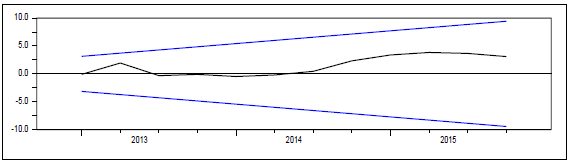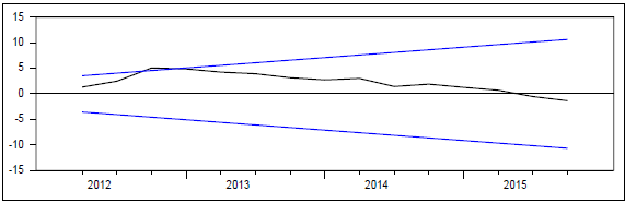 La tabla 8 evidencia el comportamiento de ruido blanco de los residuales del modelo ARIMA (7,1,3) para la serie ln(GSRCont)t, no rechazando las hipótesis nulas de normalidad y de no autocorrelación. Al calcular la prueba no paramétrica CUSUM que tiene por hipótesis nula la buena especificación del modelo, en un nivel de confianza del 95%, se observa que estos presentan un comportamiento adecuado (gráfico 5).