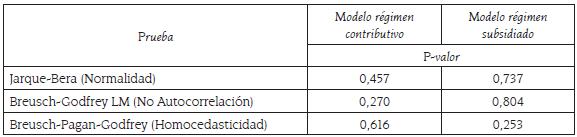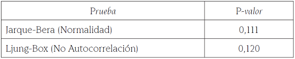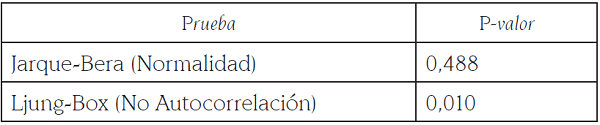 En la tabla 5 se presentan todas las pruebas sobre los residuales de los modelos de regresión estimados, donde se observa un buen comportamiento, al no rechazar las hipótesis nulas de normalidad, no autocorrelación y homocedasticidad, en un nivel de significancia del 5%.