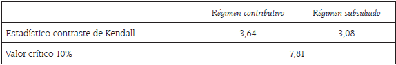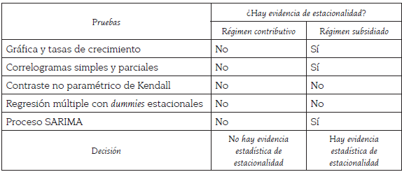 El contraste no paramétrico de Kendall arroja que para ambos casos (regímenes contributivo y subsidiado) no se rechaza la hipótesis nula de no estacionalidad, a un nivel de significancia del 5%. Es decir que calculados los estadísticos, se establece que no hay evidencias estadísticas de componentes estacionales (tabla 2).