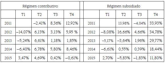 Similar comportamiento se obtiene al observar las tasas de crecimiento trimestral (tabla 1). En el régimen contributivo no hay un patrón definido, mientras que en el régimen subsidiado las tasas más altas se evidencian en el cuarto trimestre (columna T4), donde siempre se tienen crecimientos mayores al 10%, atípicos para el resto de trimestres (T1, T2 y T3).
