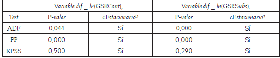 Antes de realizar el ajuste y la estimación de los modelos mediante máxima verosimilitud, se aplicaron las pruebas de raíces unitarias Dickey-Fuller Aumentada (ADF), Phillip-Perron (PP) y Kwiatkowski-Phillips-Schmidt-Shin (KPSS) a las variables ln(GSRCont)t y dif _ ln(GSRSubs)t , para determinar si son estacionarias o no. La tabla 6 muestra que en un nivel de significancia del 5%, para las pruebas ADF y PP se rechaza la hipótesis nula de raíz unitaria, y para la KPSS no se rechaza la hipótesis nula de estacionariedad.