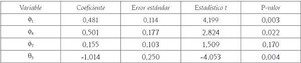 Para el caso del régimen contributivo, basándose en los criterios de información Akaike y BIC, y en el buen comportamiento de los residuales, se logró ajustar un modelo Arima (7,1,3) para la serie ln(GSRCont)t, estimando solo los coeficientes φ1, φ4, φ7 y θ3 (tabla 7). Todos los coeficientes son significativos a un alfa del 5%, menos φ7, el cual se hace necesario incluir para tener unos residuales no correlacionados. No hubo necesidad de contar con parte estacional para la modelación.