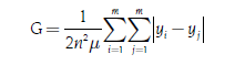 (7)Dónde G es el coeficiente de Gini; n es el tamaño de la población; yi, yj el ingreso del i-ésimo o j-ésimo individuo; μ es el ingreso medio y m es el número de ingresos distintos.