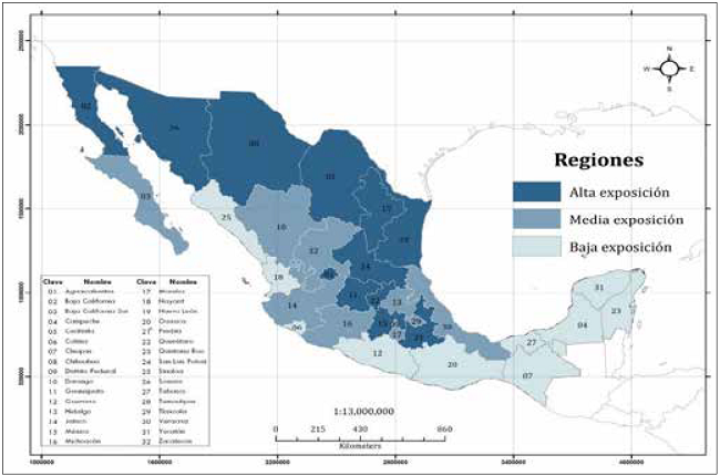 En la literatura es posible encontrar tantas divisiones regionales como criterios e intereses se emplean para tal propósito. Con el fin de utilizar una regionalización que alcance a reflejar las dinámicas actuales de exposición al comercio exterior en México, se retoma la propuesta de Aguilera y Castro (2016), la cual consiste en una regionalización de tipo económico que agrupa a los Estados de la república mexicana (unidades político- administrativas subnacionales), según su grado de apertura comercial (ver gráfico 1).