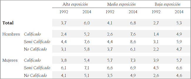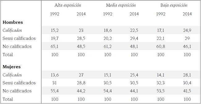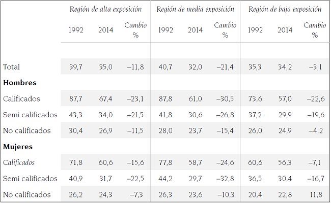 Al comparar la estructura del empleo intra y entre regiones, los datos de la tabla 2 corroboran que, si bien el trabajo menos calificado exhibió mayor demanda en la región de alta exposición entre los años 1992 y 2014 (65,1 y 48,5% hombres, y 55,4 y 44,2% mujeres), creció la intervención del trabajo calificado en el empleo regional, debido a un aumento en la participación de los hombres (7.8 puntos porcentuales) y las mujeres (13.4 puntos porcentuales).