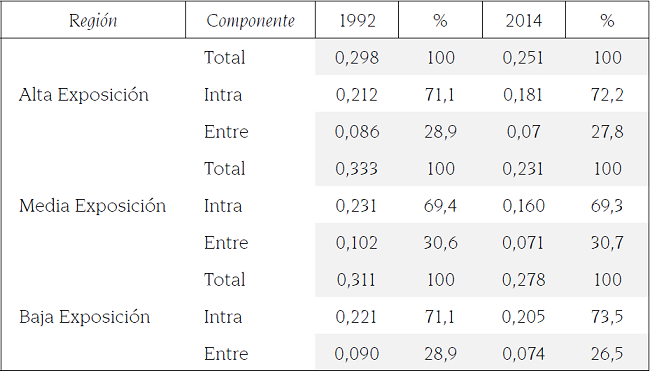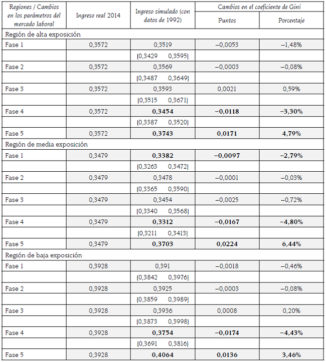 Los ejercicios de simulación sugieren que, la distribución del empleo por nivel de calificación y el efecto ingreso, constituyen los factores relevantes que intervinieron en las variaciones de la desigualdad salarial en las tres regiones. Las cifras significativas en aminorar el coeficiente de Gini expresan que, a partir del proceso de liberalización comercial, la acentuación de la demanda de fuerza de trabajo calificada y semi calificada, así como la contracción del trabajo no calificado de ambos sexos, perturbaron de manera desfavorable las disparidades en el ingreso, ya que de haberse mantenido la misma estructura que prevalecía en 1992, la brecha salarial sería menor a la observada en el 2014. En la región de alta exposición se tendría un coeficiente de Gini de 0,345, es decir, 3,3% más bajo; en la región de media exposición sería 4,8% inferior, mientras en la región de baja exposición la reducción sería de 4,4% (ver tabla 5).
