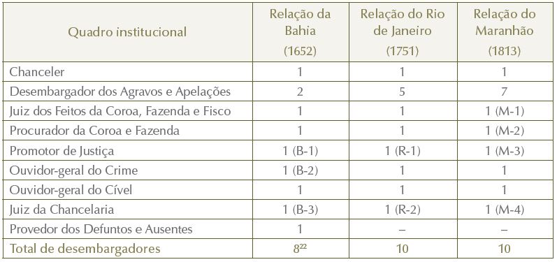 Portanto, o presente artigo tem como objetivo trazer uma contribuição, realizando uma breve análise comparativa do estabelecimento dos três primeiros tribunais de justiça instituídos na América portuguesa, buscando identificar possíveis diferenças na organização administrativa das Relações e nas motivações para sua instituição em determinadas localidades, considerando o quadro institucional, as trajetórias dos magistrados nomeados para o ofício de chanceler e designados para conduzir a instalação dessas instituições, bem como a primeira turma de desembargadores.