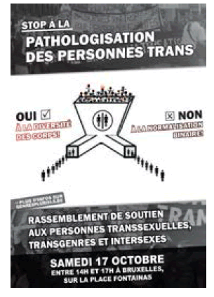 El hecho de que aún persista una acalorada controversia en torno a la ‘etiología de la disforia’ (Dellacasa, 2017) –en el campo de la salud prevalecen tanto las teorías innatistas (neuroendocrinología y genética), como las provenientes del campo psi (respecto de la conformación de la identidad y la sexualidad en la infancia)– confronta con la postura despatologizante que sostienen las personas trans organizadas en diferentes colectivos en varios países del mundo[5]. Actualmente, desde el campo biomédico la experiencia trans está categorizada como un disturbio de la identidad y figura en la DSM 5 (APA, 2013) bajo la denominación “disforia de género”.