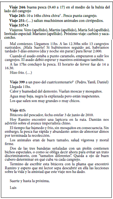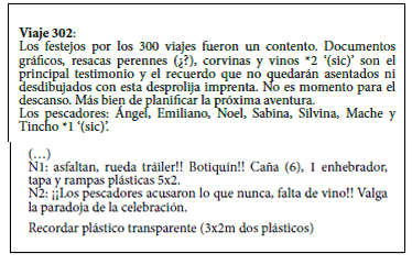 Un objeto que facilita la coordinación de los viajes es un cuaderno en el que toman nota de aquellos datos significativos para la organización de un trabajo grupal y rotativo. A los pocos días después que los acompañé en mi primera pesca, me prestaron un ejemplar viejo porque pensaron que me podía servir para entender qué sucedía en los viajes de pesca. La función principal de estos apuntes podría haber sido cumplir con una tarea organizativa, es decir, anotar qué hace falta llevar al viaje siguiente y tener al alcance información de relevancia para la actividad (como los teléfonos de las Termas Marinas, de la pescadería o de los integrantes del laboratorio). Pero en estas bitácoras hay más que eso. Los viajeros fueron volcando diversos sucesos de sus expediciones. Su tono ameno, por momentos creativo y hasta poético, contrasta notoriamente con el abigarrado y hostil lenguaje de los artículos científicos. Son “diarios de navegación” en los que aparece descripta una instancia de la investigación que permanece en la intimidad de los integrantes del laboratorio.