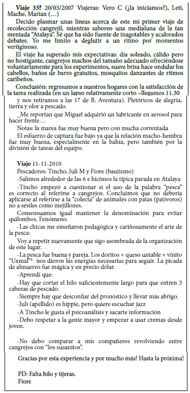 Estas instancias rituales y colectivas que comparten los integrantes del laboratorio no tienen como implicancia la homogeneidad del grupo, ni que todos sus miembros vivan estas situaciones de la misma manera. Sin embargo, dan cuenta de la formación, e incluso creación, de los límites de una comunidad (Moore y Myerhoff, 1977). El sentido grupal de estos viajes, incluidos los disensos o cuestionamientos que se manifiestan por escrito (por ejemplo, si parar o no en Atalaya, o cómo nombrar la actividad de pesca o recolección de cangrejos), se pone en evidencia aún más en las siguientes entradas: