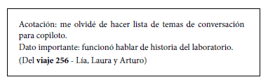 En estos viajes las memorias del grupo se comparten y sostienen en el tiempo a través de prácticas transmitidas como tradición (los rituales) y oral (las narraciones) (Ramos, 2011:133). La historia que hicieron y vivieron los sucesivos integrantes del laboratorio está presente en las bitácoras, pero también es vivida y transmitida en cada pesca. Fue por esas relaciones que pude ir comprendiendo los hábitos de estos científicos en la trastienda de sus investigaciones, como cuando María Eugenia me explicó una de las reglas del viaje en auto que luego encontré referida en el cuaderno de viaje: