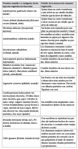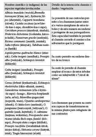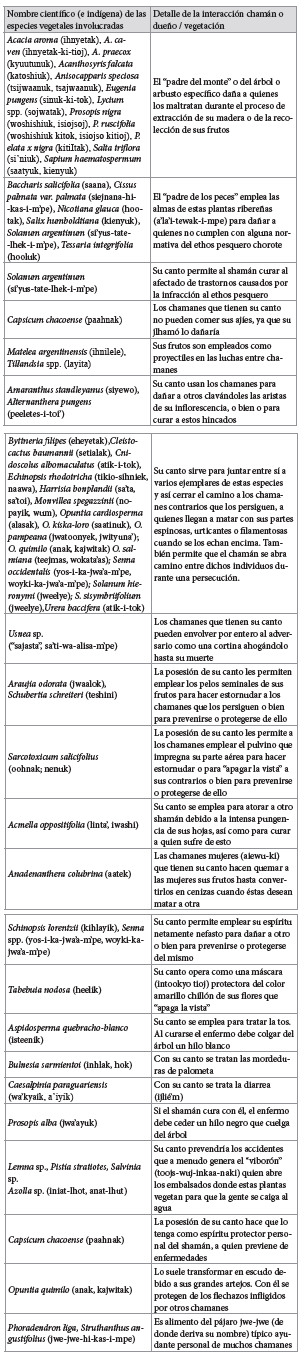 En total se registraron 95 especies vegetales y 1 hongo con 166 datos etnobotánicos asociados a la actividad y al ideario shamánico. En las Tablas 1 a 4 se enumeran las plantas involucradas con su nombre científico e indígena (iyojwa’ha e iyowujwa), así como observaciones sobre su empleo o significado en este ámbito de interacción. Las especies vegetales con mayor número de interacciones identificadas fueron Sarcotoxicum salicifolium (oohnak, nenuk) con 5 datos, Anisocapparis speciosa (tsijwaanuk, tsajwaanuk), Bromelia hieronymi (k’isie, isa’), Byttneria filipes (eheyetak), Opuntia quimilo (anak, kajwitak), Prosopis alba (jwa’ayuk) y Schinopsis lorentzii (kihlayik) con 4, Aspidosperma quebracho-blanco (isteenik), Ceiba insignis (semlhak), Echinopsis rhodotricha (tikio-sihniek, naawa), Fridericia dichotoma (tooksiaka, katoojs-kalik), Harrisia bonplandii (sa’ta, sa’toi), Manihot esculenta (var. venenosa) (kinyewi, shimkiw’), Monvillea spegazzinii (nopayik, wum), Opuntia cardiosperma (alasak), O. kiska-loro (saatinuk), O. pampeana (jwatoonyek, jwityuna’), O. salmiana (teejmas, wokata’as), Salta triflora (shinyuk) y Tabebuia nodosa (heelik) con 3 datos cada uno. Las principales categorías de interacciones planta-shamán identificadas fueron para ejercer el daño (56 datos, 34%), como protección o refugio (47,28 %), como instrumento de su accionar (25,15 %), en rituales propiciatorios (15,9 %), terapéutica vegetal (remedios) (12,7 %) y preventivos (11 datos, 7 %).