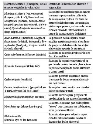 Como se mencionara anteriormente, la posesión del “canto” de una planta permite emplearla como auxiliar shamánico, tanto para ocasionar un determinado tipo de daño como para protegerse del mismo[21]. De esta manera se emplea la capacidad de daño y/o protección de plantas tóxicas (como Sarcotoxicum salicifolium y la variedad venenosa de M. esculenta), espinosas (cactus), espinuladas (frutos de Byttneria filipes), urticantes (Cnidoscolus albomaculatus), que rinden proyectiles (frutos de Araujia odorata), lazos (tallos volubles de Funastrum gracile), así como de protección o refugio (troncos de Ceiba spp.); de transporte aéreo (troncos de Aspidosperma quebracho-blanco), entre otros. Los detalles de estas aplicaciones se describen en la Tabla 1 y 3.