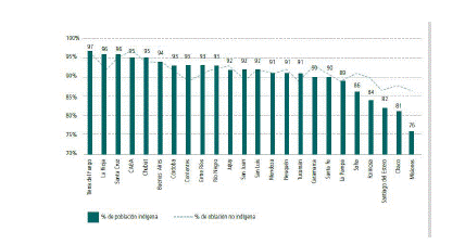 En 2019 aparecieron excepcionalmente en los medios masivos de comunicación varias notas periodísticas sobre los pueblos indígenas de Argentina, posiblemente por el impacto que tuvo la declaración del Año Internacional de las Lenguas Indígenas (Naciones Unidas). De las muchas notas, una llamó profundamente nuestra atención, se titulaba “Educación indígena: el analfabetismo duplica el promedio nacional y faltan docentes preparados” (INFOBAE, 24/04/2019). Esta nota reflejaba datos de un informe del Observatorio de la Universidad Pedagógica Nacional (UNIPE, 2019), que retomaba centralmente los últimos valores disponibles, del Censo Nacional de Población, Hogares y Viviendas (INDEC, 2010). Según esos datos, el porcentaje de personas analfabetas en todo el país mayor de 10 años es del 1,9%; pero asciende a 3,7% entre la población indígena. Más aún, como puede observarse en el Gráfico Nº1, entre la población indígena esta cifra aumenta considerablemente en algunas jurisdicciones tales como Misiones (14,9%) y Chaco (14,3%) que encabezan el listado. Ese dato acaparó especialmente nuestra atención porque desde hace años venimos estudiando aspectos de la implementación de la Educación Intercultural Bilingüe (EIB) en esas dos provincias, que según nuestros análisis se encuentran en las antípodas en relación con el desarrollo de la EIB; pero que logran resultados similares en cuanto al analfabetismo y rendimiento educativo de sus poblaciones indígenas. En ese mismo informe se presentan para Misiones y Chaco las tasas más bajas de asistencia escolar (para poblaciones indígenas y no indígenas) a nivel nacional (Ver Gráfico Nº2). Sorprenden estos resultados tan análogos –que a su vez no se reducen a una sola muestra estadística (INDEC, United Nations Educational, Scientific and Cultural Organization –UNESCO-, Ministerio de Educación)– porque son escenarios históricamente muy diferenciados. El aspecto que comparten, como todos los pueblos indígenas de Argentina, refiere a los contextos de desigualdad socioeconómica en que se enmarcan las condiciones de diversidad socioeducativa que, aunque transciende la variable étnica, se correlaciona de forma estable en las poblaciones indígenas locales.