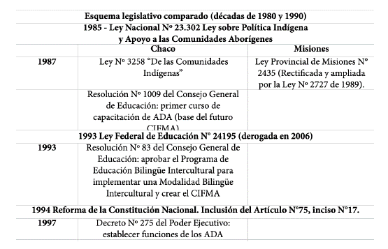 En cuanto a lo educativo cabe explicitar que, tanto para la provincia de Chaco como para Misiones, el sistema escolar para las comunidades indígenas previo a la sanción de estas leyes presentaba el típico modelo de una educación homogeneizadora de las diversidades étnicas y lingüísticas. Las propuestas educativas de “modalidad aborigen” que responden a las demandas indígenas específicas sobre los contenidos, docentes y materiales recién podrán empezar a pensarse posteriormente. Con anterioridad a las experiencias sistemáticas de EIB, existían iniciativas escolares de la mano de algunas ONG y órdenes religiosas, como las experiencias escolares fundadas por la iglesia católica y por misioneros protestantes (Hirsch y Serrudo, 2010; Enriz et al., 2017; y Rosso y Artieda, 1999).