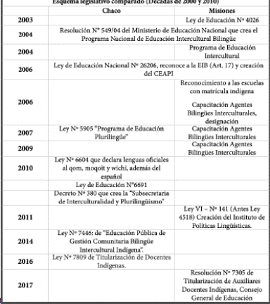 En síntesis, en este apartado abordamos una etapa de gran intensidad en la producción de las políticas estatales de educación. Las experiencias y lineamientos de la modalidad de EIB en el Chaco y Misiones han ido de la mano de los procesos políticos nacionales y locales y de la sanción de legislación específica; sin embargo, fueron también redefiniéndose y adaptándose a las demandas de los pueblos indígenas y a las problemáticas coyunturales. En el espacio temporal que ocupa toda la década de 1990 las experiencias se diferencian de un modo abismal, mientras en Chaco se activa fuertemente el diseño y la implementación de políticas educativas interculturales, en Misiones se desarrolla un período de ampliación de la oferta educativa que se respalda en las acciones individuales de los/as docentes que atienden a esas poblaciones en las escuelas. Pero el nuevo impulso que los programas de EIB tienen a nivel nacional y local a mediados de la década del 2000 coincide con una nueva cantidad de normativas en ambas jurisdicciones. En Chaco el paradigma de la EIB se complejiza ya que se oficializan a las lenguas indígenas y se sanciona la Ley que posibilita la creación de escuelas Gestión Comunitaria Bilingüe Intercultural Indígena. De ese modo, se consolida el perfil protagónico del movimiento indígena y su inserción en la esfera estatal a través de diversos puestos laborales. Por su parte, en Misiones se implementa un cambio absolutamente radical y transformador: la inclusión de la EIB en la ley educativa provincial, el reconocimiento específico de las escuelas de EIB y la formación e incorporación formal a las aulas de los ADI.