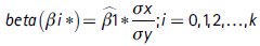 Los coeficientes estandarizados o beta miden el cambio en la variable dependiente generado por un cambio unitario en la variable independiente, con todo lo demás constante. Dichos cambios, tanto en la variable dependiente como independiente, son medidos en unidades de desviación estándar. Y se obtienen así: