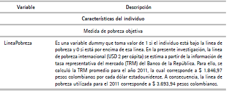 En el cuadro 1 que se presenta a continuación se observa una caracterización de los individuos que se autoperciben en situación de pobreza en Colombia durante el 2011. En referencia a la edad, en promedio, los individuos que se consideran pobres tienen 31 años. Respecto a los años de educación, en promedio los individuos que se consideran pobres cuentan con 8 años de educación realizados. En lo correspondiente al sexo, encontramos que de los individuos que se consideran pobres, un 52,32% son mujeres, a diferencia de un 47,68% que son hombres. En lo concerniente a la posición ocupada en el hogar, se observa que los miembros secundarios del hogar constituyen el 71,87% de los individuos que se consideran pobres, mientras que los jefes del hogar representan solo un 28,13%. Esto indica que los tamaños de las familias son grandes. Sobre el estado civil del individuo, el cuadro 1 muestra que las personas no comprometidas (solteras, separadas o viudas) representan la mayoría de pobres subjetivos (53,98%), en comparación con un 46,02% de personas que están comprometidas (casadas o en unión libre).