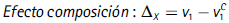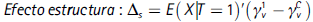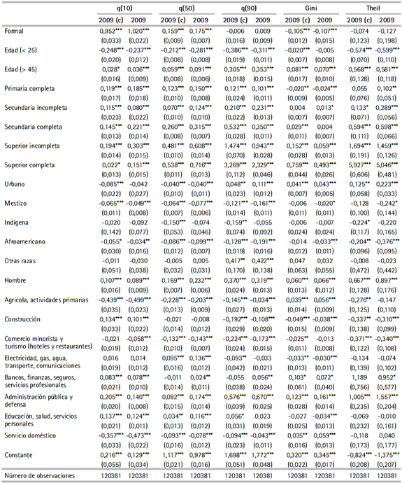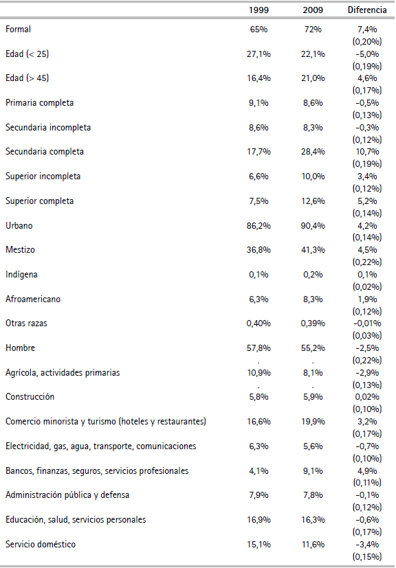 (5)La interpretación de cada componente es muy simple: el efecto composición mide la parte del cambio distributivo que es atribuible al hecho de que las características observables de los trabajadores se hayan modificado entre 1999 y el 2009, mientras que el efecto estructura es causado exclusivamente por la diferencia entre las distribuciones del salario condicional en esas características. Usualmente, este efecto es asociado al cambio en las retribuciones de las características observables de los trabajadores.