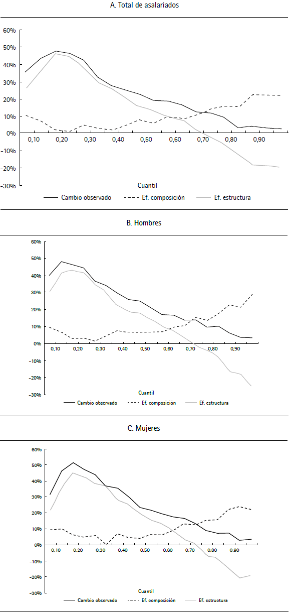 En la figura 7 se muestra la descomposición agregada del cambio (en logaritmos) experimentado por cada ventil del salario horario para el conjunto de los asalariados y distinguiendo entre hombres y mujeres. En la figura 7A, la línea oscura muestra el cambio observado en la distribución del ingreso por hora de los asalariados, cuyos incrementos focalizados en los primeros ventiles se tradujeron en una reducción sustancial de la desigualdad salarial. Puntualmente, mientras que el 5% que más gana percibió un alza de salario del 3%, el grupo de trabajadores que pertenece al 30% que menos gana vio incrementado su poder adquisitivo en un promedio del 42%, siendo los cuantiles 0,15 y 0,20 los que más se beneficiaron con un aumento salarial del 48% y del 46%, respectivamente.