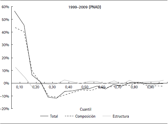 Elaboración propia sobre la base de Instituto Brasileiro de Geografia e Estatística (IBGE), encuestas nacionales de hogares (PNAD).La línea etiquetada como "composición" representa el efecto sobre cada ventil que tendría un escenario contrafáctico en donde habría cambiado solamente la proporción de ocupados formales entre 1999 y el 2009, mientras que la estructura salarial y el resto de las características permanecieran inalteradas. Por otro lado, el efecto de estructura representa los resultados obtenidos en un escenario contrafáctico en el que lo único que se modifica son las brechas salariales de los trabajadores formales (también denominado efecto de estructura salarial o de retorno)11. Por último, el efecto total consiste en la suma de ambos efectos parciales.